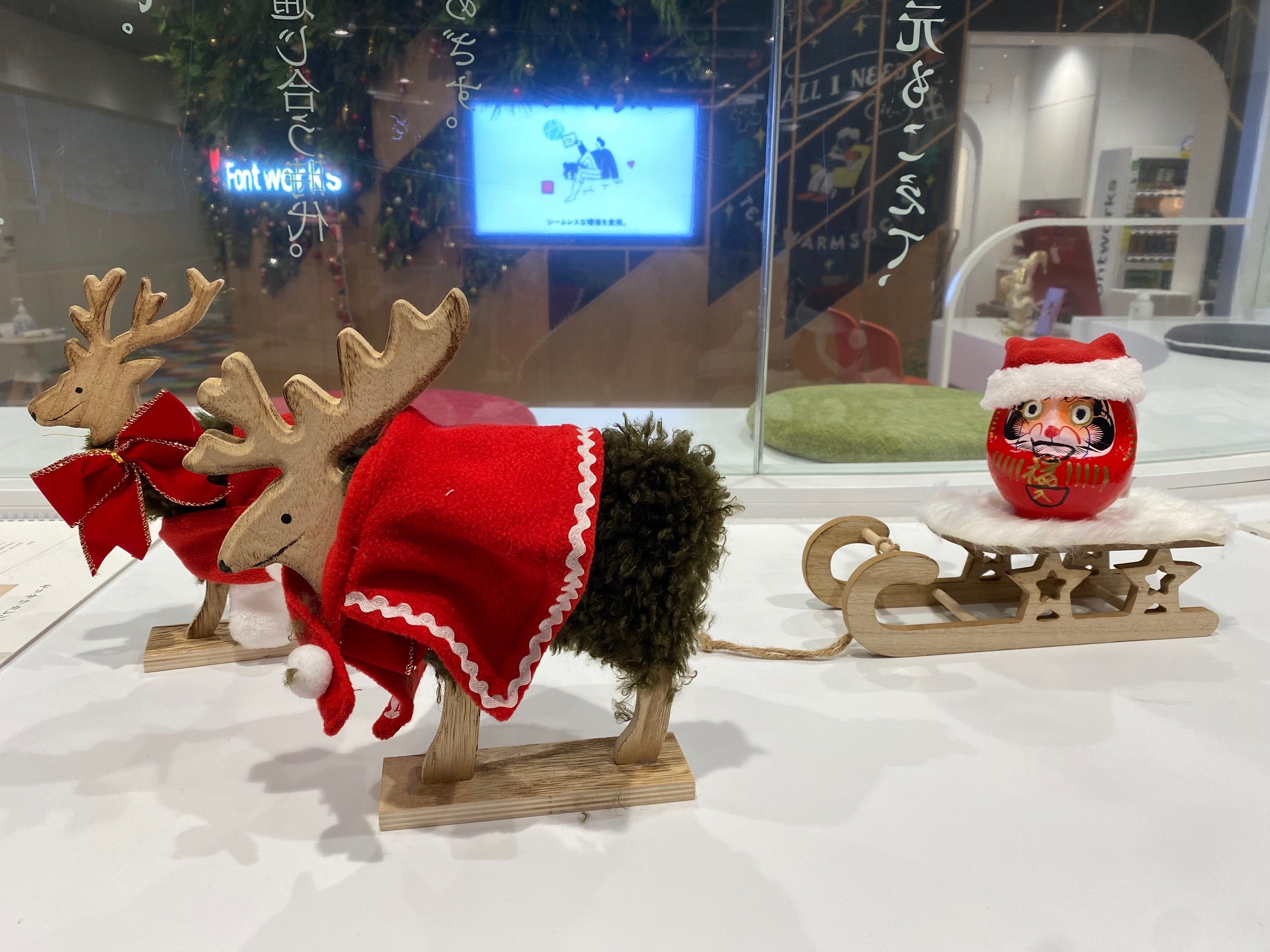可愛らしいトナカイ達の後ろには、サンタに扮したダルマさんが・・・!
