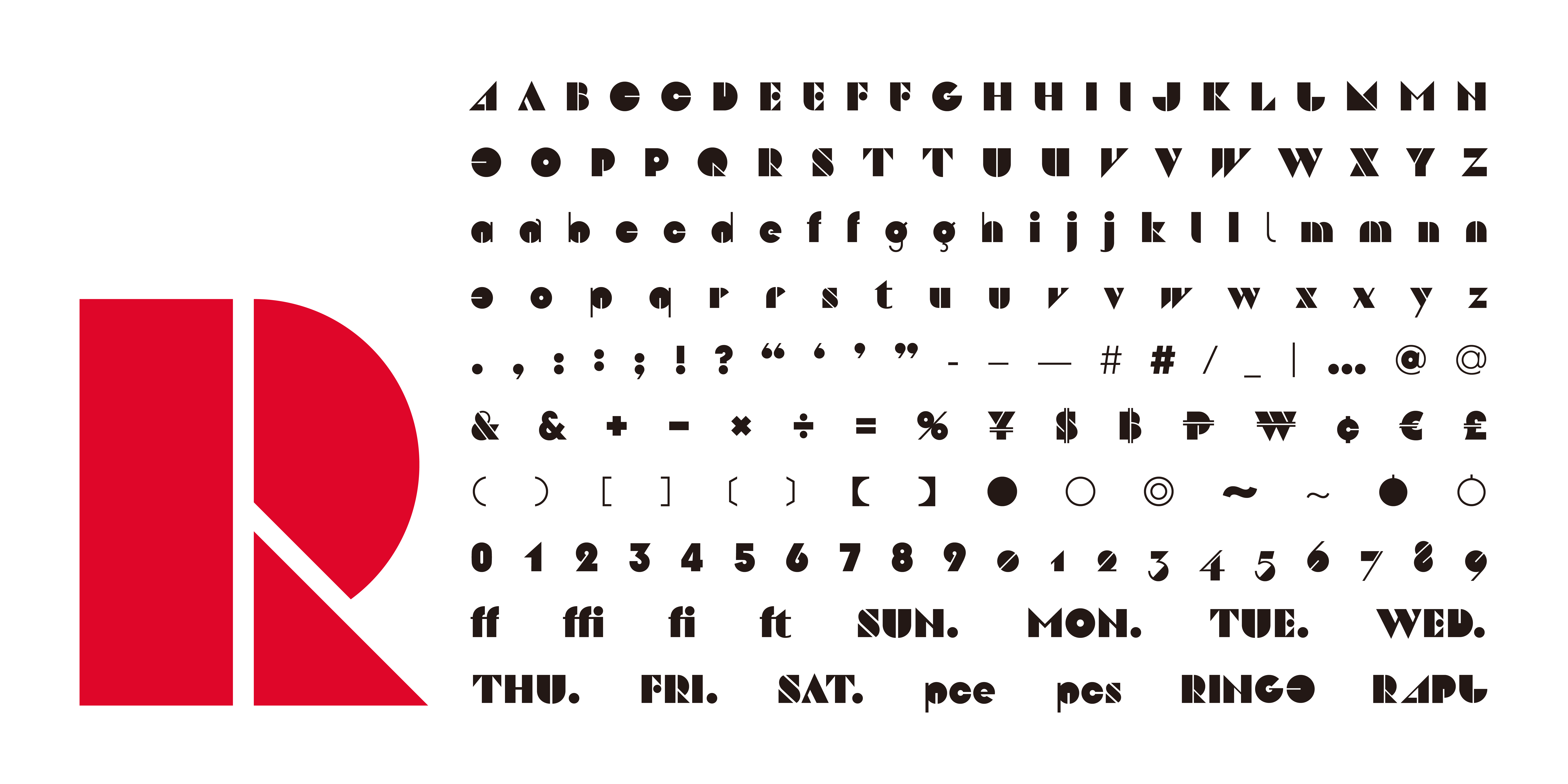 RINGO TYPE BOLD is a typeface jointly developed by Fontworks Type Designers Yuya Nakamura and the RINGO creative team. Based on the existing RINGO logotype, it was designed to convey a consistent brand message, reflecting the characteristics of the brand design: "simple and minimal," "high-quality," "attention to detail," and "exceptional."