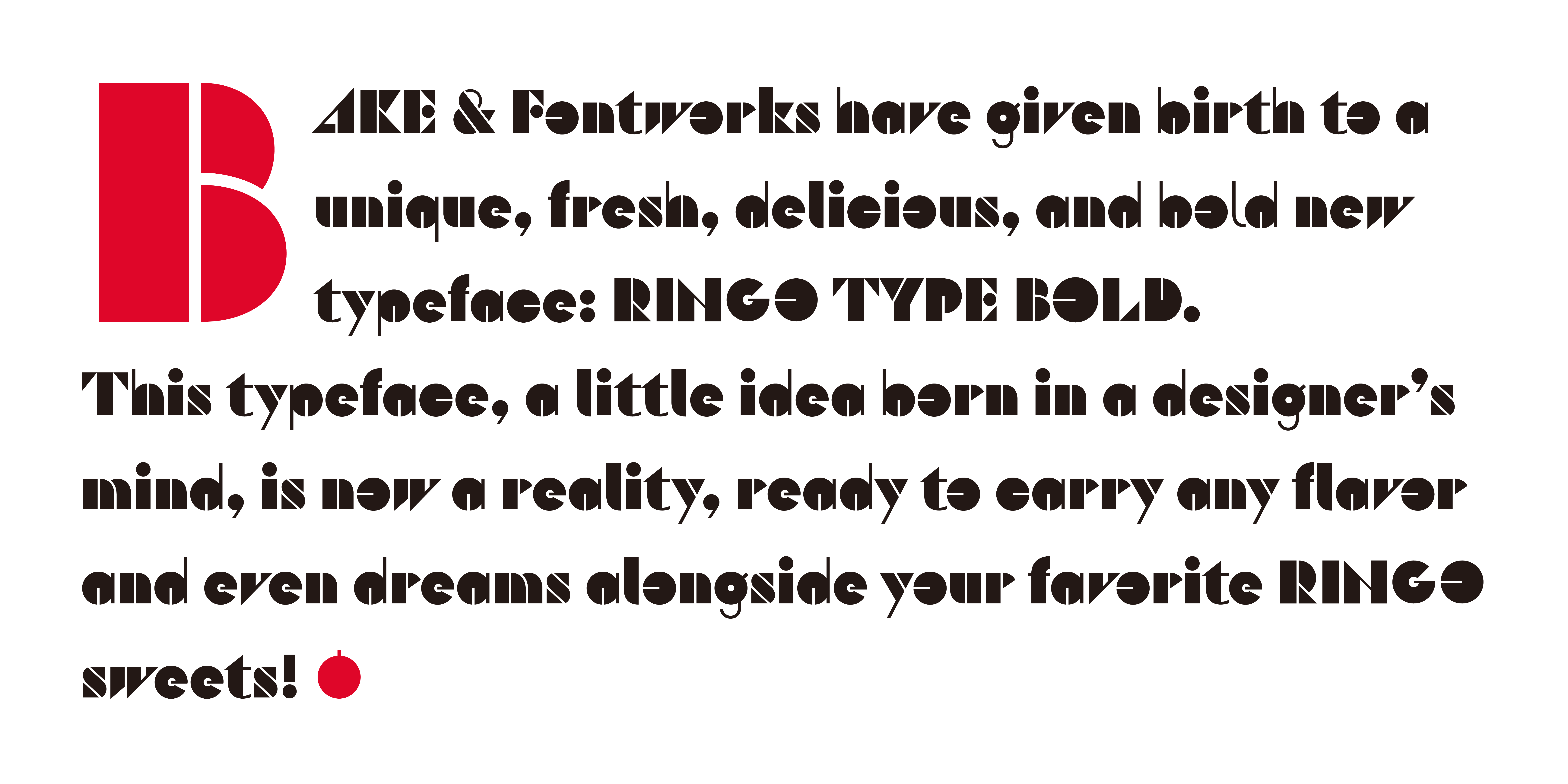 I was attracted to the RINGO logo when I saw it in town, and while thinking about why it looked so attractive, I decided that I wanted to make it into a typeface. From there, I approached BAKE about RINGO TYPE BOLD, and I'm really happy that they were pleased with it, and that they will actually use it from now on. I hope you enjoy this delicious, playful, bold typeface on the street and on the web.